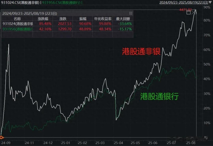 看看下面这个走势对比图。在去年9月23日以来的这波牛市行情里,港股通非银指数,涨幅高达85.48%,而港股通银行指数的涨幅是42.16%。前者的涨幅是后者的两倍之多。(数据来源:wind,数据区间:2024.9.23-2025.8.19,下图同)