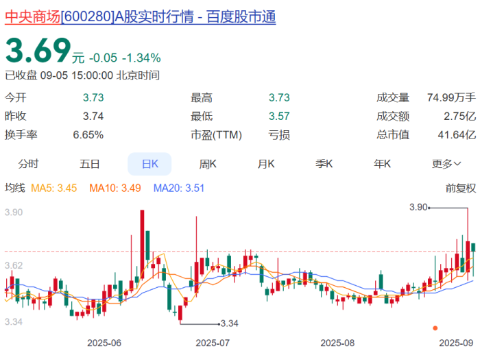 资本市场上,中央商场的股价持续震荡。9月5日,中央商场报收3.69元,跌1.34%。