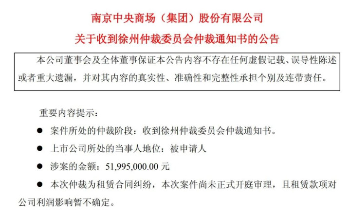 公告显示,仲裁所涉的租赁纠纷源于2018年9月10日双方签订的《租赁合同》及后续补充协议。根据约定,中央商场承租位于徐州市大同街125号地下一层(原丽人街、B层除外)和地上一至七层及8、9塔楼物业,租期20年。2022年和2023年,双方又签订两份补充协议,对租金标准及支付方式作出调整与优惠安排。