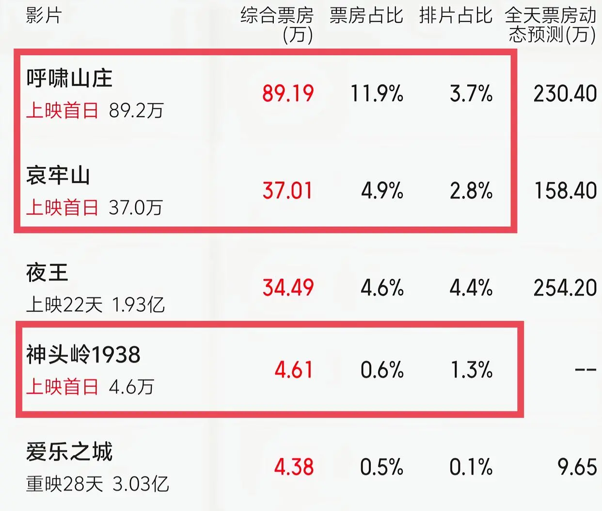 不曾想,上映首日的票房和排片,竟然会差《哀牢山》和《呼啸山庄》如此之多。