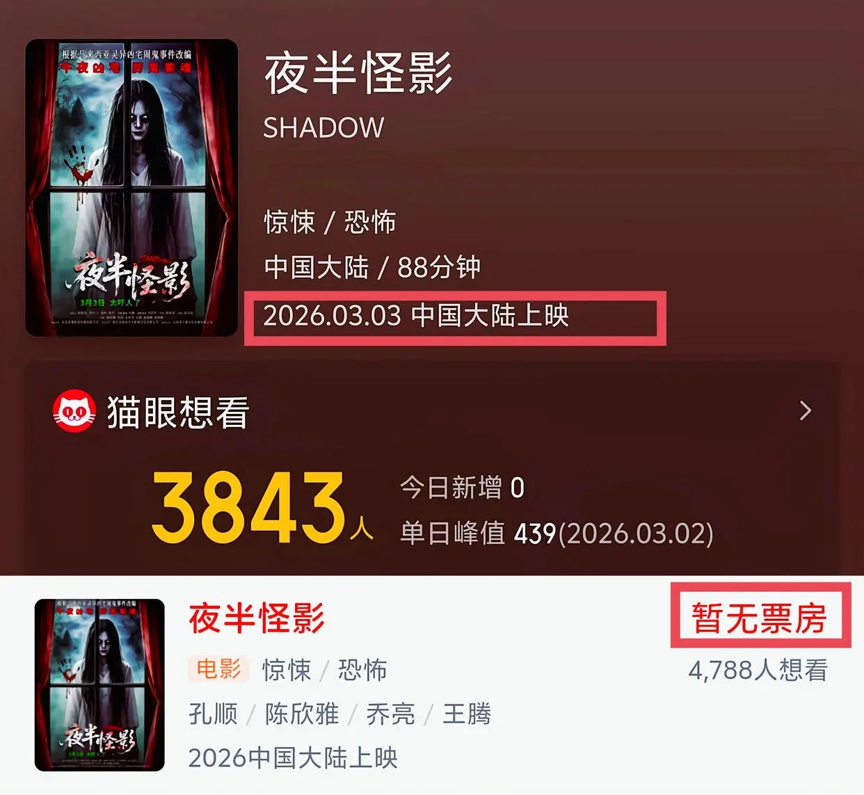 定档3月3号的《夜半怪影》,某眼想看人数3843,某票票想看人数4788。