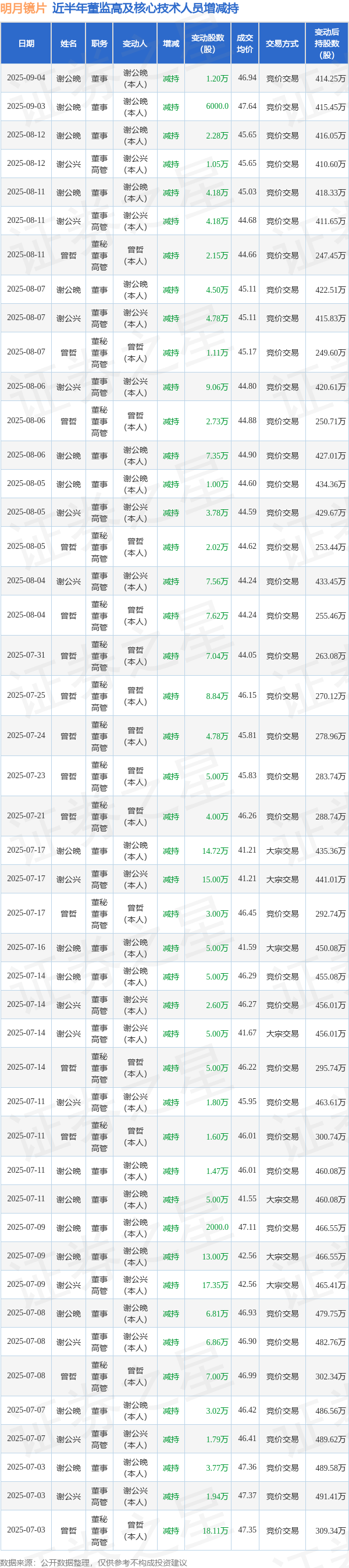 明月镜片近半年内的董监高及核心技术人员增减持详情如下: